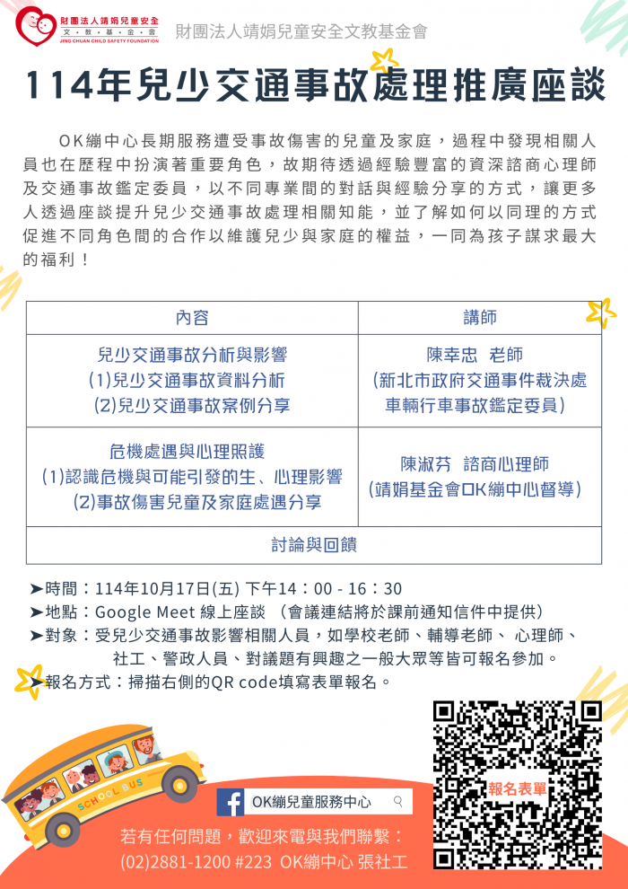 轉知財團法人靖娟兒童安全文教基金會OK繃兒童服務中心將於114年10月17日(星期五)辦理「114年兒少交通事故處理推廣座談」,請踴躍參加。