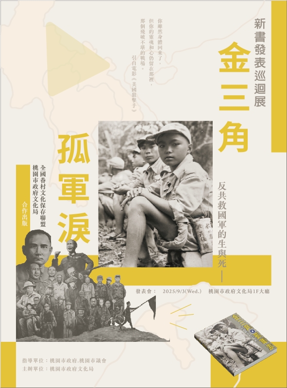 一、 由桃園市政府文化局與全國眷村文化保存聯盟共同出版的《金三角孤軍淚-反共救國軍的生與死》,聚焦38年國軍退守金三角的歷史,透過口述訪談與珍貴影像,真實呈現雲南反共救國軍在泰緬邊境三十年的奮戰歷程,歡迎有興趣的民眾至馬祖新村參觀「孤軍淚新書發表巡迴展」。